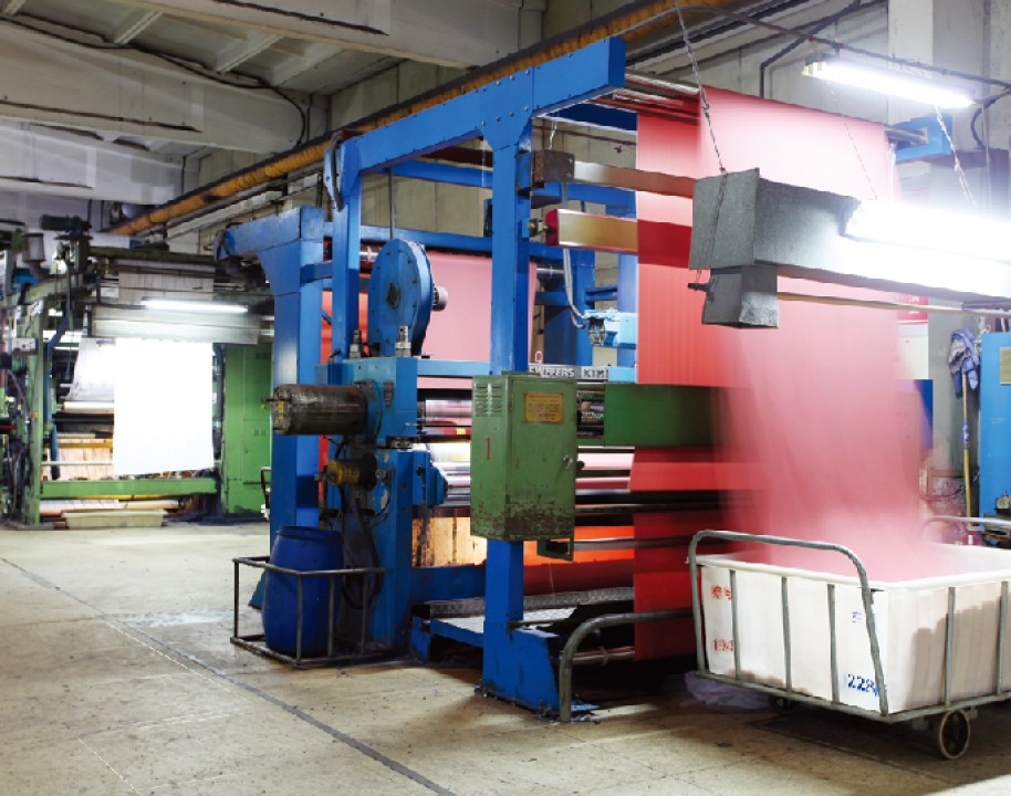 主要印染加工各類全棉、T/R、T/C及棉裘系列各種印花染色產品,有韓國進口定型機6臺、長車軋染線3條、配套前道蒸漂絲光